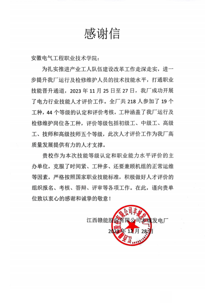 近期,江西赣能股份有限公司丰城发电厂发来感谢信,对我院为公司提供高质量的职业技能等级认定和职业能力水平评价工作表示高度肯定和由衷感谢。