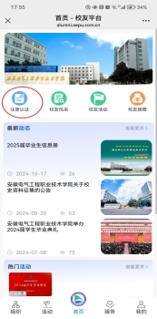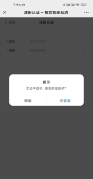 第二步:进入校友平台界面,点击左上角的“注册认证”,出现登录提示,点击“去登录”进入登录后界面;登录后,返回首页,再次点击注册认证。