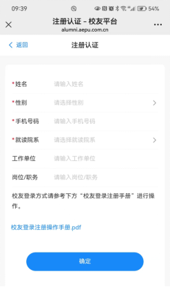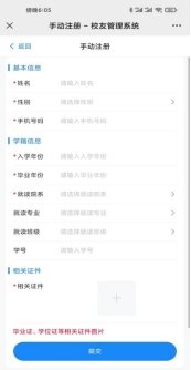 第三步:进入注册认证界面,标星号的必填,填完直接认证成功,进入到首页可进行校友服务操作。