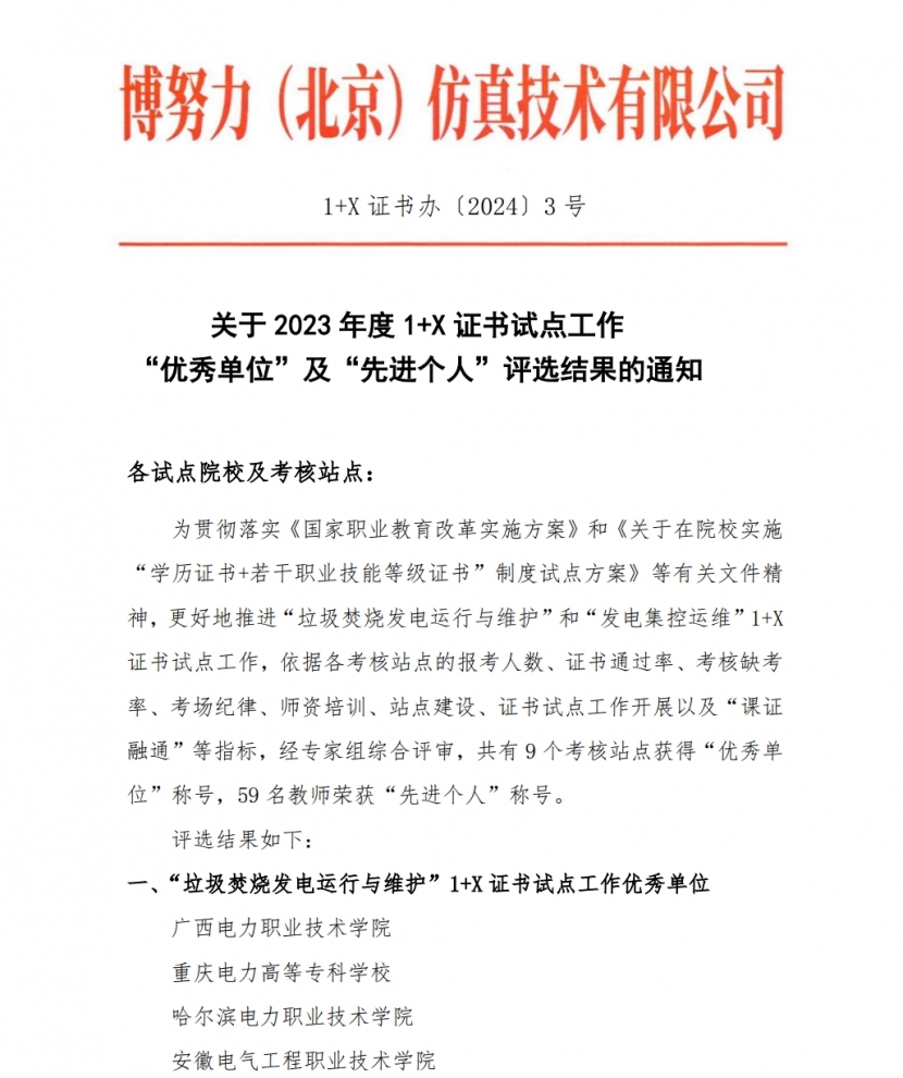 学院在2023年度1+X试点工作中表现突出,被评为2023年度“垃圾焚烧发电运行与维护”1+X证书试点工作“优秀单位”,动力工程系陈雷宇、韩佳园两名教师被评为1+X证书试点工作“先进个人 ”。