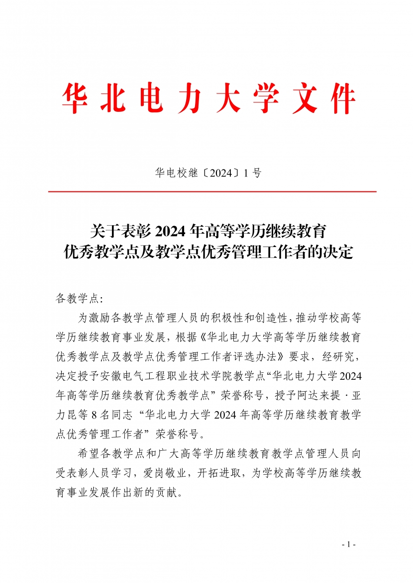 近日,华北电力大学公布了2024年高等学历继续教育“优秀教学点”和“优秀管理工作者”的评选结果。我校被授予“优秀教学点”荣誉称号,何鹏同志被授予“优秀管理工作者”荣誉称号。