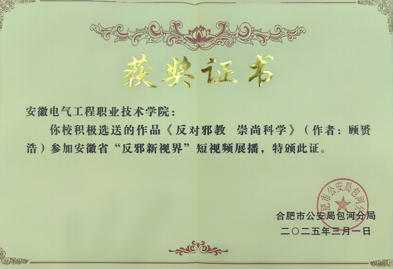 近日,由合肥市公安局包河分局组织开展的“反邪新视界”短视频评选活动落下帷幕,学院顾赟浩同学制作的反邪教视频《反对邪教 崇尚科学》成功入选安徽省“反邪教新视界”短视频展播。