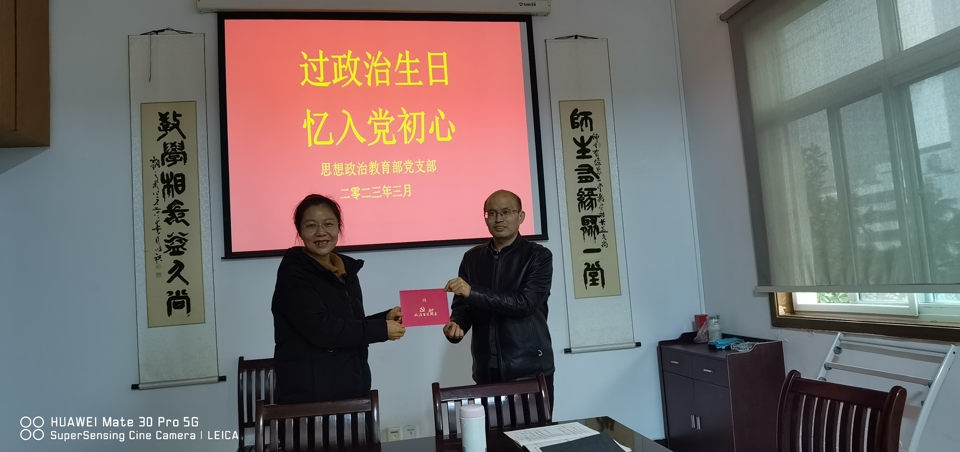 与此同时,支部以“过政治生日 忆入党初心”为主题,为党员汪邦银过“政治生日”。相继开展了谈心谈话、赠送政治生日纪念卡和红色书籍、党员本人发表政治生日感言等。党员汪邦银谈了自己政治生日感言。他说,入党24年,始终不忘初心,在不同岗位上能够发挥一名党员一面旗的作用,作为教师,坚持立德树人和教书育人;作为党员,能够亮身份、做表率;作为管理者,能够以上率下,发挥引领作用。24年后的今天,我将继续围绕中心,服务大局,始终坚持理想信念大于天,始终牢记责任使命扛在肩,始终恪守清正廉洁系心间,为学校高质量发展和“五型”美好校园建设作出自己更大贡献!